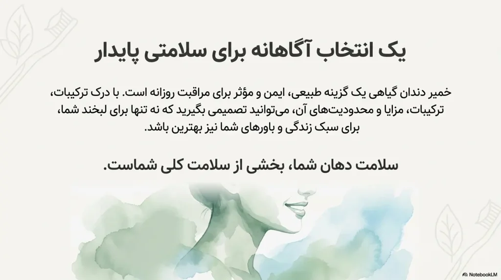 در نهایت، خمیر دندانهای گیاهی میتوانند گزینهای عالی برای افرادی باشند که به دنبال سبک زندگی سالمتر و پایدارتر هستند.خمیر دندان گیاهی گزینهای طبیعی، ایمن و مؤثر برای مراقبت روزانه از دهان و دندان است. اگر به دنبال کاهش تماس با مواد شیمیایی و حفظ سلامت لثه و دندانهای خود هستید، این محصولات میتوانند انتخاب مناسبی برای شما باشند.