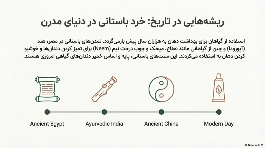 استفاده از گیاهان برای مراقبت از دهان و دندان به هزاران سال پیش بازمیگردد. در تمدنهای باستانی مانند مصر، هند و چین، از گیاهانی مانند نعناع، میخک و دارچین برای خوشبو کردن دهان و تمیز کردن دندانها استفاده میشد. در آیورودا، سیستم پزشکی سنتی هند، استفاده از چوب درختانی مانند نیم (Neem) برای تمیز کردن دندانها رایج بود. این چوبها نهتنها به تمیز کردن دندانها کمک میکردند، بلکه خواص ضدباکتریایی و ضدالتهابی نیز داشتند.