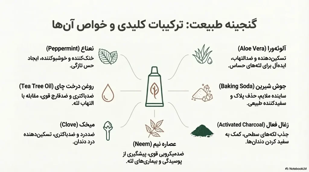 خمیر دندانهای گیاهی معمولاً از ترکیبات طبیعی تشکیل شدهاند که هر کدام فواید خاصی برای سلامت دهان دارند. برخی از ترکیبات رایج عبارتند از: