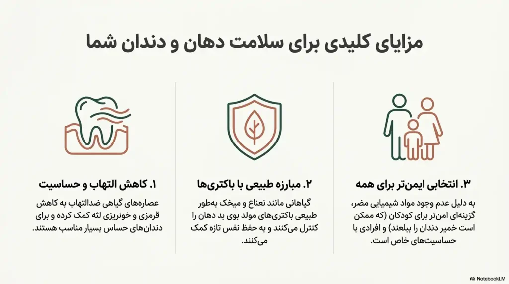 استفاده منظم از خمیر دندان گیاهی میتواند فواید متعددی برای سلامت دهان داشته باشد: