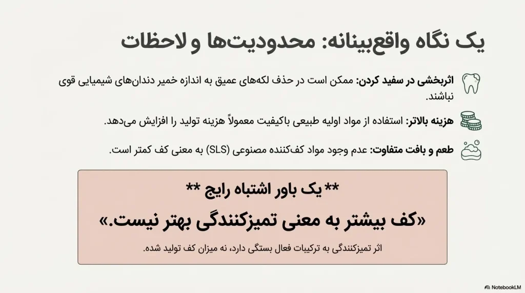 با وجود فواید متعدد، خمیر دندانهای گیاهی نیز محدودیتهایی دارند که باید در نظر گرفته شوند: